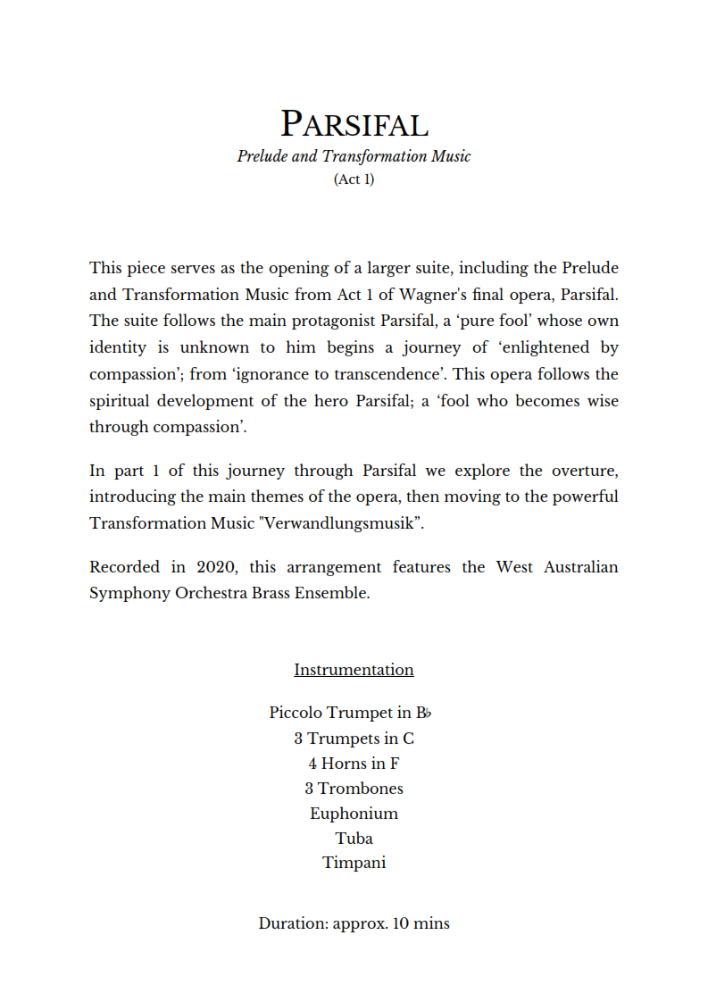 This piece serves as the opening of a larger suite, including the Prelude and Transformation Music from Act 1 of Wagner's final opera, Parsifal. The suite follows the main protagonist Parsifal, a ‘pure fool’ whose own identity is unknown to him begins a journey of ‘enlightened by compassion’; from ‘ignorance to transcendence’. This opera follows the spiritual development of the hero Parsifal; a ‘fool who becomes wise through compassion’.