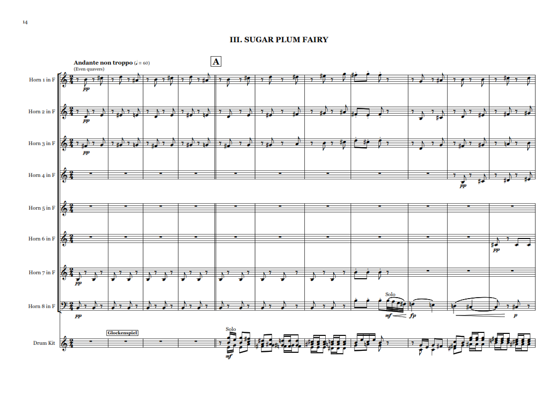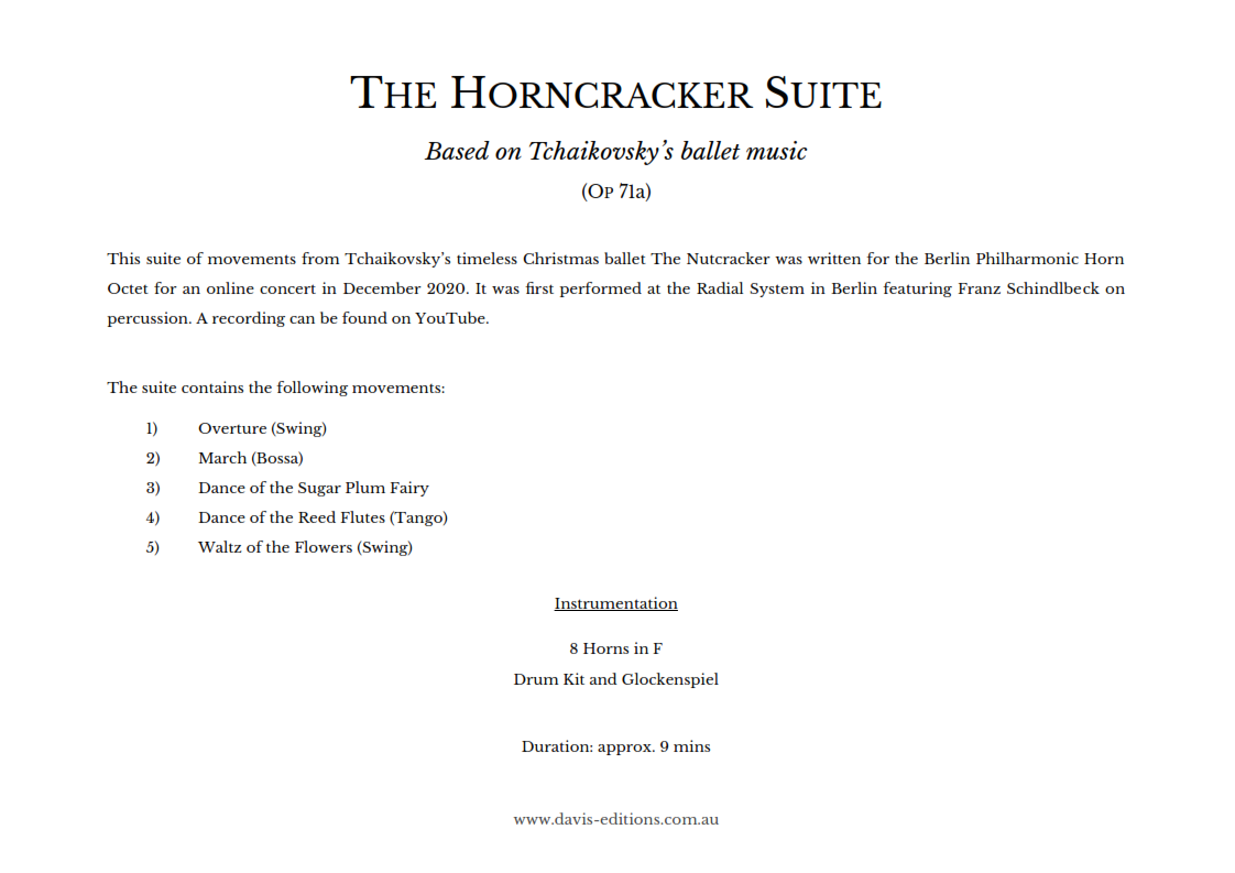This suite of movements from Tchaikovsky’s timeless Christmas ballet The Nutcracker was written for the Berlin Philharmonic Horn Octet for an online concert in December 2020. It was first performed at the Radial System in Berlin featuring Franz Schindlbeck on percussion.